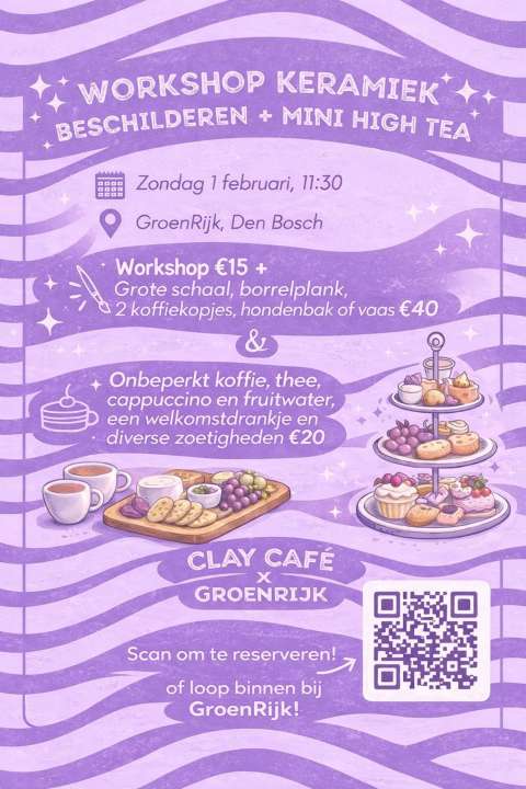 Op zoek naar een gezellige en creatieve zondagmiddag? Kom keramiek beschilderen tijdens CLAY CAFÉ X GROENRIJK DEN BOSCH en geniet ondertussen van een ontspannen mini high tea.
