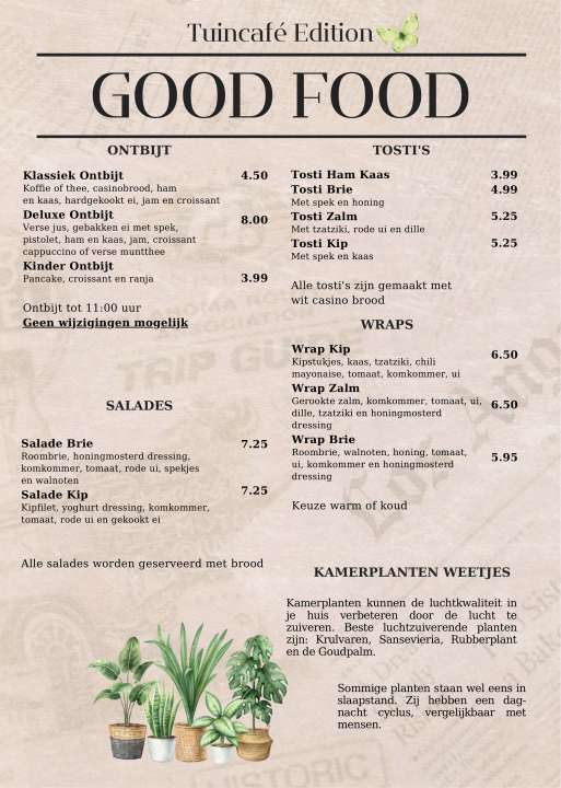 Het menu wordt aangepast aan het seizoen. Denk aan bier en worst in oktober, snert in de winter en aspergesoep in de lente. We serveren naast de 'gewone' koffie ook speciale koffies en hebben een ruime keuze aan theesmaken. U kunt naast een heerlijke lunch, soep, diverse belegde broodjes en salades ook terecht voor een ontbijt met onder andere verschillende broodjes, yoghurt en smoothies. Waar kunt u de dag relaxter beginnen dan in een tuincentrum? Elke maand voegen we een nieuwe lunchaanbieding toe aan ons assortiment. Kom langs in het tuincafé om dit te proeven! We hanteren eerlijke prijzen en daarnaast kunt u gemakkelijk en gratis parkeren. We zijn 7 dagen per week zijn geopend en het tuincafé wordt ook gebruikt voor allerlei activiteiten, denk bijvoorbeeld aan workshops of lezingen. We begroeten u graag in ons tuincafé. De koffie staat klaar!