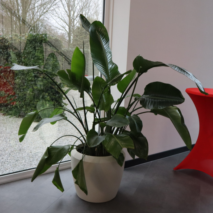 Bij binnenkomst valt direct de grote, indrukwekkende strelitzia op, die meteen een frisse en inspirerende eerste indruk geeft. Door de combinatie van verschillende planten en groottes is er een prettige, levendige sfeer ontstaan die rust en energie tegelijk biedt.