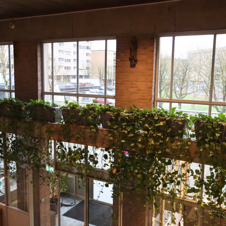 Bij Sint-Janslyceum in Den Bosch hebben we de entree en hallen mogen vergroenen. Bij de ingang zorgen prachtige bakken met hangplanten direct voor een wauw-effect en verwelkomen bezoekers en leerlingen met een frisse, groene uitstraling.