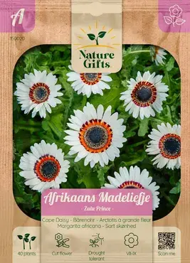 Afrikaans madeliefje zulu prince, crèmewitte straalbloemen met een zwart hart en oranje ring. Droogtetolerante plant, ideaal om open plekken in de border op te vullen en geschikt als snijbloem.