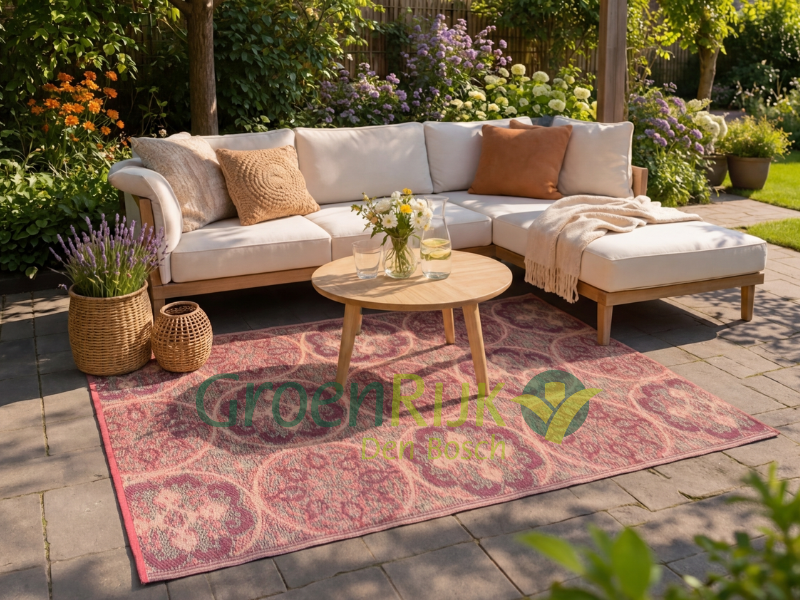 Creëer een warme en uitnodigend terras met dit prachtige tuinkleed. Het verfijnde medaillon ontwerp, uitgevoerd in zachte roze- en diepere paarstinten, zorgt direct voor een luxe uitstraling op je terras of balkon. Het is de perfecte aanvulling voor wie houdt van een sfeervolle en kleurrijke zithoek.