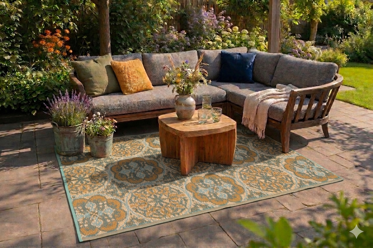 Creëer een natuurlijke en rustgevende ambiance in je buitenruimte met dit groen bruine buitenkleed. Een duurzame keuze die perfect blendt met de planten en elementen in je tuin.