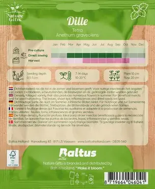 Deze Dille tetra is een speciale selectie voor de echte liefhebber van vers groen. In tegenstelling tot de gewone dille, is deze 'Tetra' variant krachtiger, intenser, groeit hij compacter en produceert hij aanzienlijk meer blad. Zaaitijd: maart - september. Bloeitijd: mei - oktober.