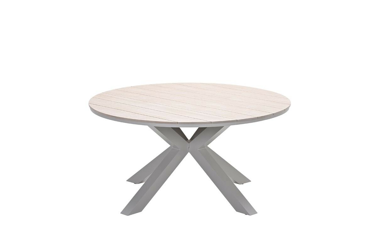 Het lichte aluminium frame is afgewerkt met een duurzame poedercoating, waardoor de tafel roest- en weerbestendig is en weinig onderhoud nodig heeft. Het ronde tafelblad is vervaardigd van Vironwood, een hoogwaardige kunststof met een realistische houtnerfstructuur. Zo geniet je van de warme uitstraling van hout, zonder het onderhoud dat traditioneel hout vraagt.