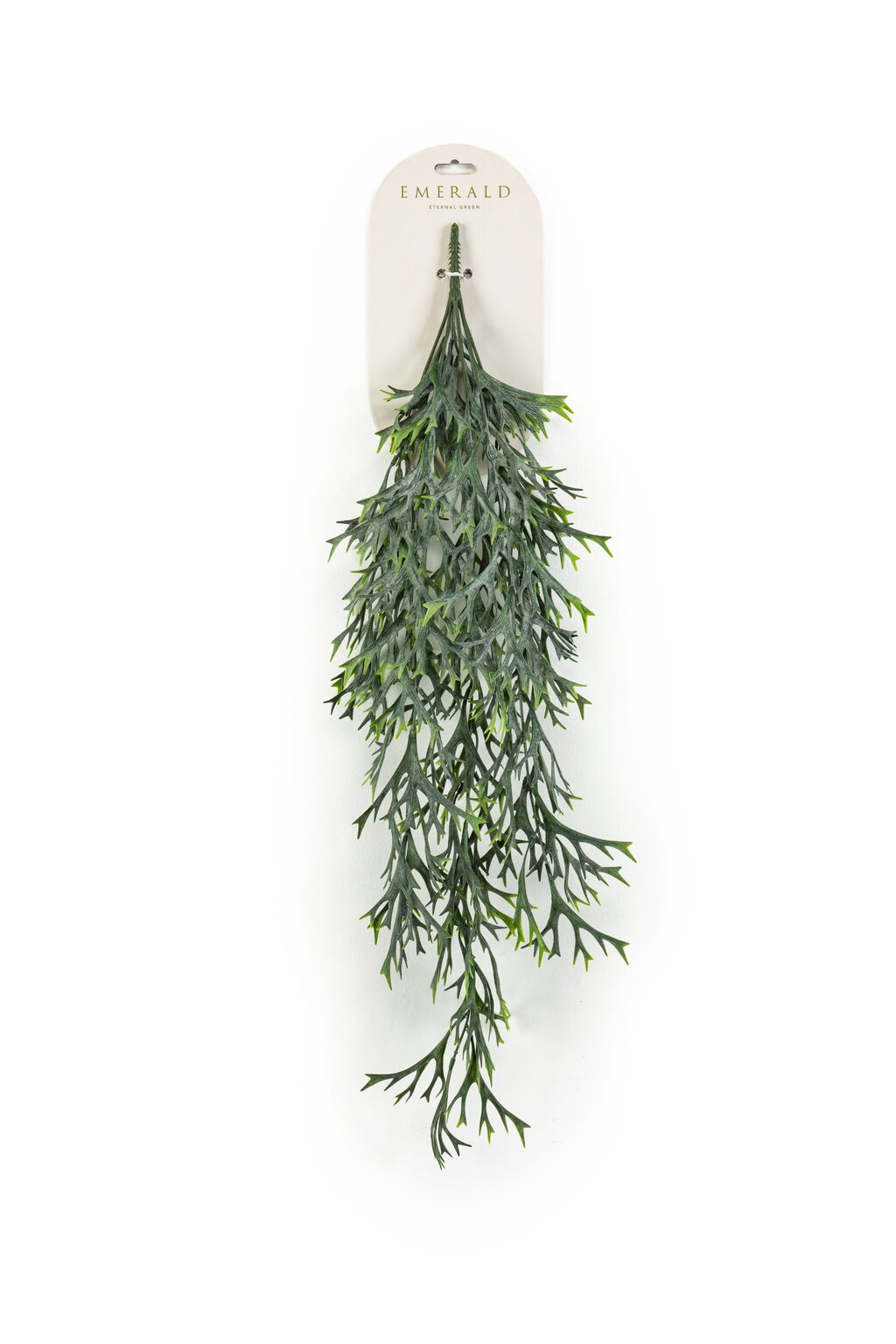 De Hertshoorn is een van de meest herkenbare varens dankzij de bladeren die lijken op het gewei van een hert. Deze kunsthangplant van 25 cm vangt de essentie van de plant perfect met zijn grijsgroene kleur en de kenmerkende 'viltachtige' laag die op de bladeren lijkt te liggen. Het is de ideale plant voor wie houdt van een botanisch statement dat net even anders is dan de standaard groene plant.