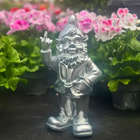 Maak kennis met de meest opvallende rebel voor in de tuin: de Stoobz "F*ck You" kabouter in een strakke zilveren uitvoering. Deze kabouter neemt geen blad voor de mond en schopt met zijn iconische gebaar en glanzende look tegen alle traditionele tuinhuisjes aan. Met een hoogte van 32 cm is hij een krachtig statement stuk voor elke buitenruimte.