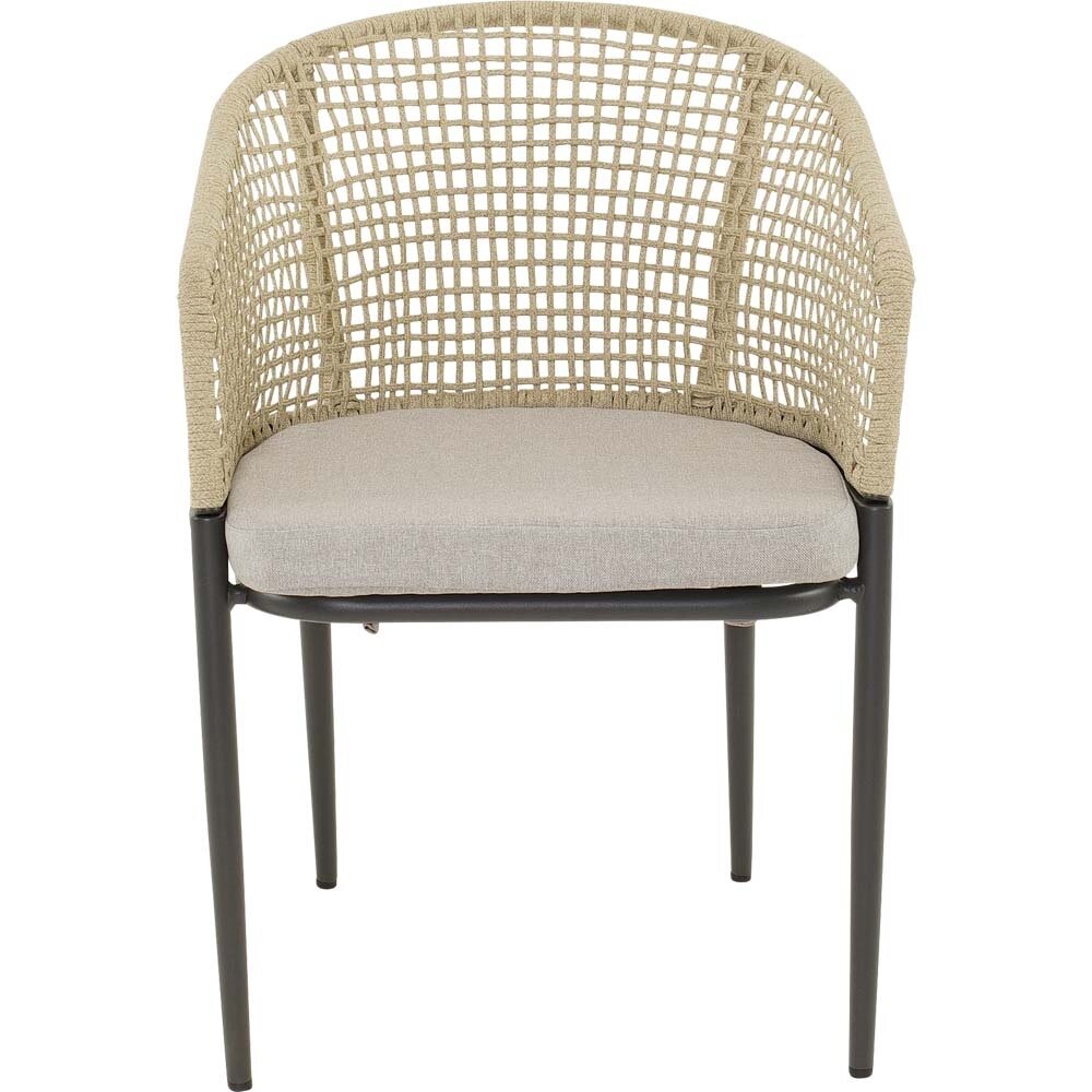 De Stoel Kioto in beige brengt tijdloos design en comfortabel zitten samen met duurzame materialen. Het mat-antraciet aluminium frame geeft een moderne uitstraling, terwijl de Ø4 mm rope in warme beige kleur een natuurlijke en stijlvolle touch toevoegt aan je tuin, balkon of terras.