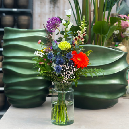 Let op: dit is een seizoensgebonden boeket. De bloemen in het boeket kunnen variëren, afhankelijk van de beschikbaarheid en het aanbod van het seizoen. Elk boeket is uniek en wordt met zorg samengesteld door onze bloemisten.