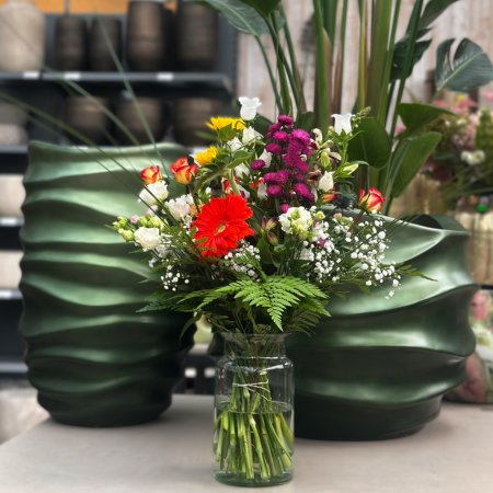 Let op: dit is een seizoensgebonden boeket. De samenstelling kan variëren afhankelijk van de beschikbaarheid van bloemen. Elk boeket is uniek en wordt met zorg en liefde samengesteld door onze bloemisten.