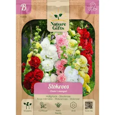 Stokroos Chaters, een bonte mix met grote, klassieke bloemen met hoge stelen. Deze bloem is ook aantrekkelijk voor bijen en vlinders. Planten tussen maart en juli. Bloeit tussen juli en september.