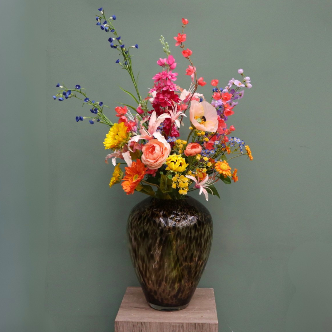 Styling tip: Dit boeket heeft door zijn hoogte en kleurkracht ruimte nodig. Plaats het op een centrale plek, zoals de eettafel of in een ruime hal, om optimaal van de kleuren te genieten.