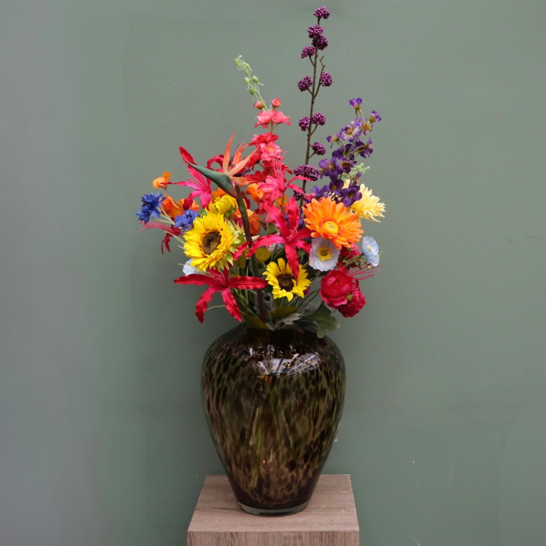 Styling tip: Dit boeket heeft de kracht om een hele kamer op te halen. Combineer het met een rustige achtergrond om de kleuren echt te laten knallen, of ga voor 'all-out' met een gedurfde vaas zoals onze luipaard-print collectie.