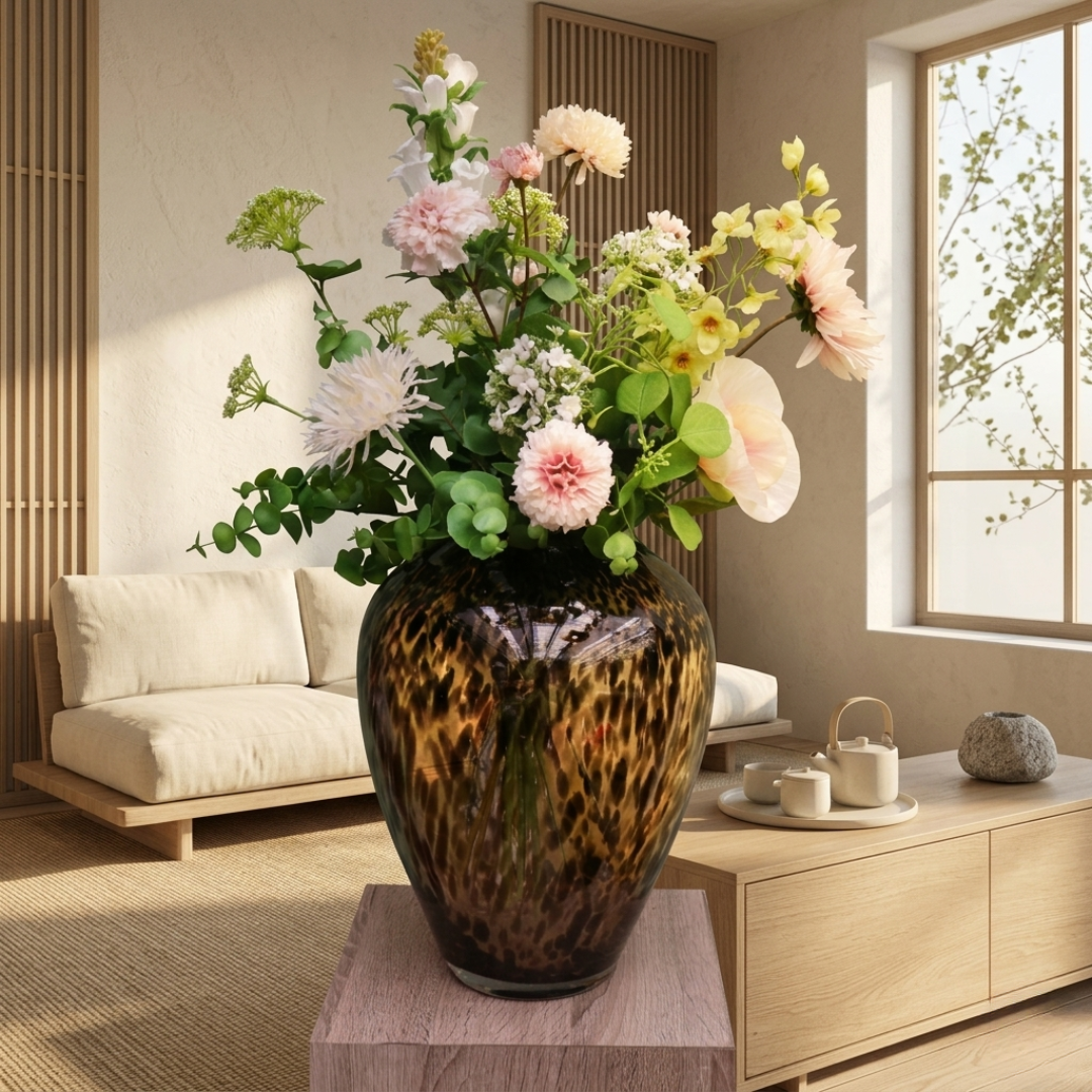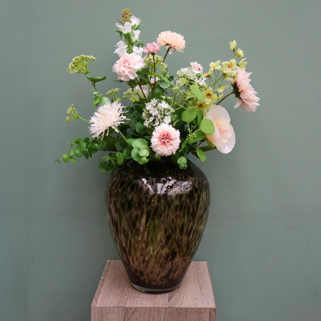 Dit boeket komt prachtig tot zijn recht in een glazen vaas of een contrasterende vaas met print (zoals de luipaardvaas op de foto). Het is het perfecte duurzame cadeau voor een housewarming, verjaardag of gewoon om jezelf te trakteren op een blijvend bloemetje.