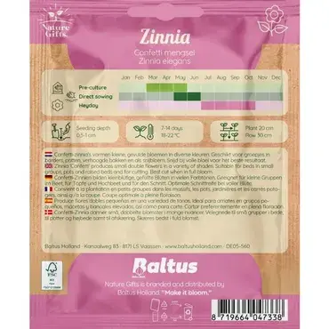 Zinnia confetti is een speelse en kleurrijke mix bloemen. Zaaitijd: maart - juni. Bloeitijd: juli - oktober.